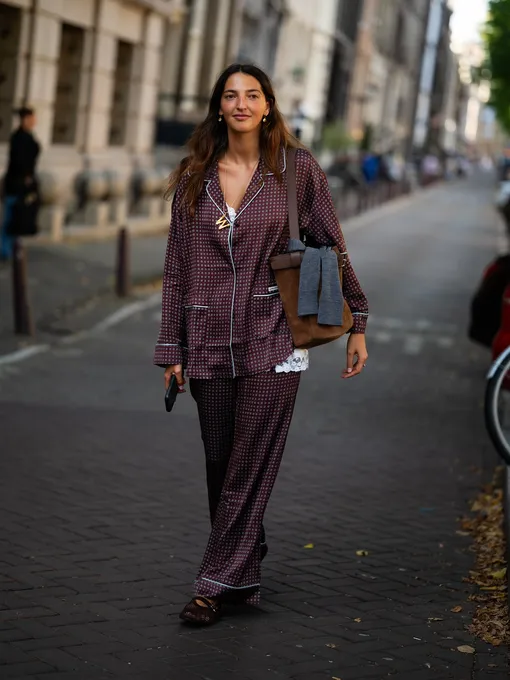 Как их стилизовать? Самый очевидный городской ансамбль — с «верхом» из того же комплекта. Такой ансамбль простой, цельный и продуманный. В прохладные дни добавьте сверху джемпер или легкий жакет. Игра на стилистических контрастах также хорошо сработает: пижамные брюки легко подружить с базовой майкой, футболкой, лонгсливом, толстовкой, тонким кардиганом или даже классической рубашкой. А для вечерних комбинаций такие брюки хорошо смотрятся с кружевным топом или блузой. Выбор обуви задает настроение всему аутфиту. Тапочки-бабуши поддержат расслабленный ритм, лоферы или балетки добавят строгости. Если хочется вытянуть силуэт и сделать образ более нарядным, смело надевайте туфли или босоножки. К примеру, актуальные с Т-образной перемычкой. Сумка? Любая, зависит от ваших задач. Это может быть вместительный тоут или сумка-почтальонка. А в галерее ниже вы найдете самые красивые пижамные штаны.