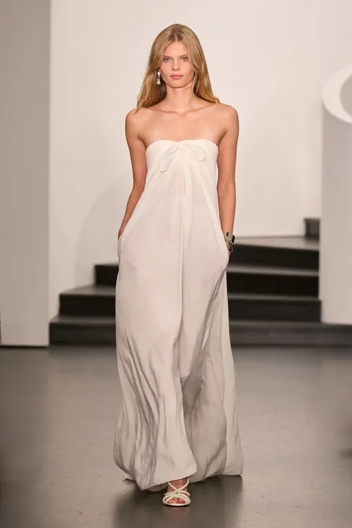 Какие именно платья-бандо будут в тренде летом-2026? Если присмотреться повнимательней, то дизайнеры делают ставку на похожие модели. Во-первых, это длина. Самые безопасные вариации, которые точно не выйдут из моды через сезон — макси в пол и мидакси, доходящие до середины икры. Такая длина «компенирует» открытый верх, засчет чего платье будет уместно смотреться практически в любом месте. Еще одна закономерность, которая объединяет все бандо, увиденные на показах ведущих брендов — единый цвет. Дизайнеры предлагают не размениваться на принты и буйство красок, а делать ставку на монохром. Среди самых популярных идей — молочные, коричневые, черные, пастельно-желтые и бежевые оттенки. А вот крой оставляет пространство для экспериментов. Поклонникам классики предлагаем присмотреться к футлярам без бретелей, идеально сидящим по фигуре. Не стоит списывать со счетов и модели с драпировками: эти элементы не только добавят платью изюминку, но и скроют все, что необходимо. Если ваш выбор — максимальный комфорт, отдайте предпочтение платьям-бандо свободного кроя.