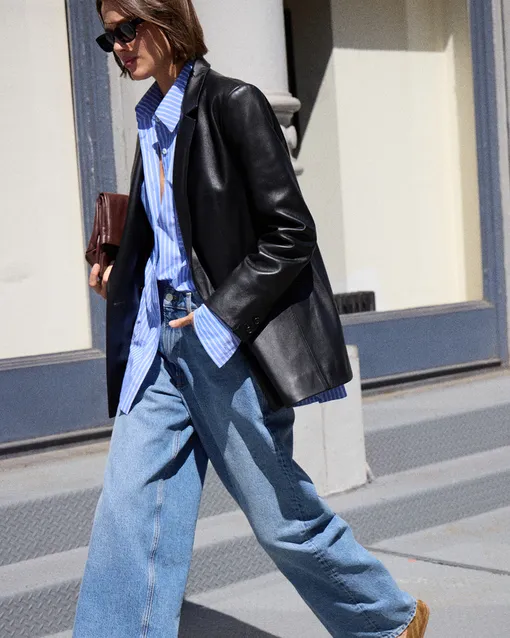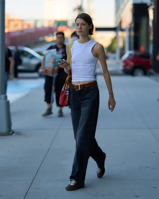 Что касается их стилизации, то предлагаем взять пару уроков по стилю у инфлюенсеров. Из-за того, что джинсы-трубы являются довольно базовой моделью, всегда можно вспомнить про правило нейтрализации и собрать комплект, который будет отвечать принципам контрастности. Для этого отлично подойдет акцентный топ – он может быть выполнен в ярких оттенках, которые сразу же притягивают взгляд. Также не стоит забывать про модели, которые раскрываются в движении – такие вариации обычно сделаны из перьев, бахромы или драпировок, плавно покачивающихся в такт вашим движениям. Впрочем, в паре с классическим жакетом, рубашкой или просто хлопковым лонгсливом такие пары будут смотреться ничуть не хуже. А обувью тоже ограничений никакних: от лодочек до кроссовок — к «трубам» подойдет все. А лучшие пары джинсов-труб на летом-2026, которые можно купить прямо сейчас, мы собрали в галерее ниже.