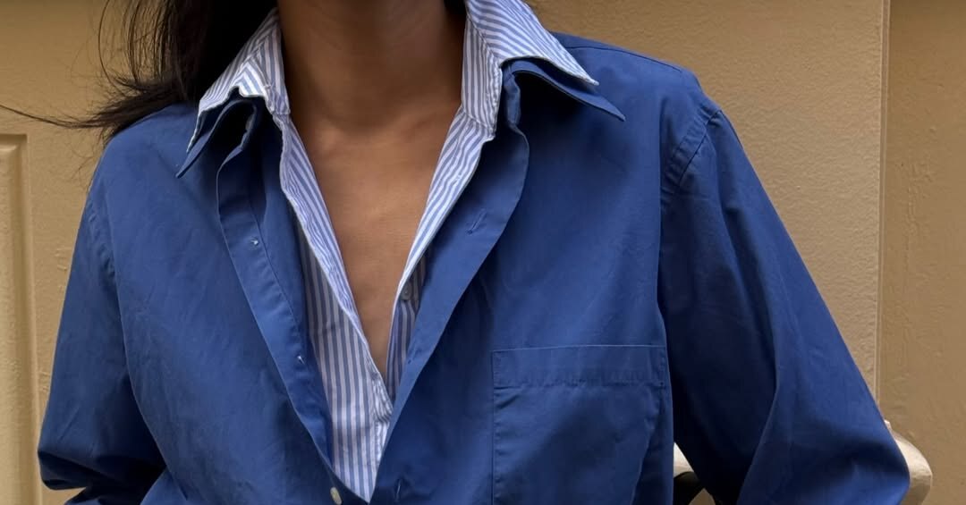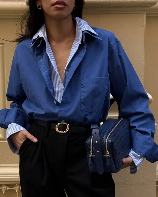 Этот прием уже успел стать классикой. Одна рубашка — в тонкую полоску, вторая — монохромная, например, синяя. Вы можете закатать рукава и поиграть с длиной. Такой дуэт добавляет характер даже самым спокойным вещам. В качестве основы ансамбля подойдут строгие брюки или юбка-карандаш.
