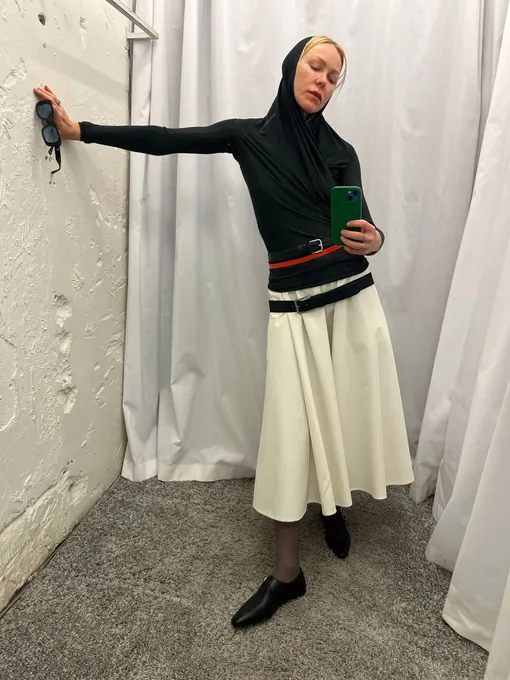 И завершает наш чек-лист вневременная концепция — два ремня. Мы уже рассказывали, что ее обожает Леандра Медин. Если вы только начинаете использовать ее, то берите два одинаковых ремня и примерьте их с юбкой. Один подчеркнет талию, а второй не затягивайте сильно, пусть создает трендовый заниженный силуэт. В этом приеме есть одна важная идея: иногда стиль можно построить на таких нюансах. Вы не усложняете гардероб, а смотрите на уже знакомые вещи под новым углом. И в этом заключается главный стилистический интерес.