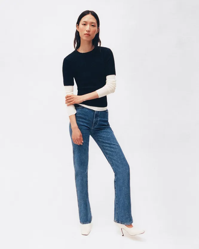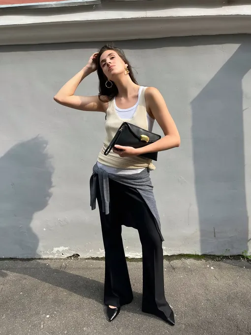 Если вы только познаете азы многослойности, то это самый простой способ начать. Приталенная майка становится базой, а сверху появляется более свободная. За счет разницы посадки слои читаются, появляется глубина. С цветом можно играть: либо на контрасте, либо на разных оттенках одного тона. И даже комбинация белого и сливочно-желтого смотрится интересно. «Низ»? Все что угодно: от джинсов до брюк-клеш. Легко, но с эффектом. Обувь? К примеру, туфли-лодочки.