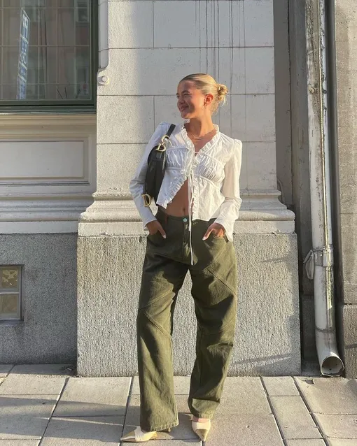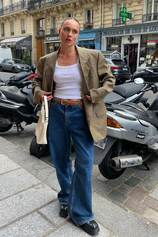 Чтобы иллюзия работала безотказно, сочетайте свободные джинсы с укороченным верхом. Такое комбо всегда визуально сужает и вытягивает фигуру, вне зависимости от ее типа. Отличной парой свободным джинсам станут укороченные футболки и майки-алкоголички, а также романтичные шифоновые блузы. Несмотря на сильный контраст двух вещей, они отлично дополняют друг друга и создают гармоничный образ. Еще один лайфхак: если джинсы вам чуть длинноваты, не стоит обрезать или подворачивать их. Просто добавьте к ним обувь на высокой подошве, чтобы ноги казались еще длиннее и стройнее.
