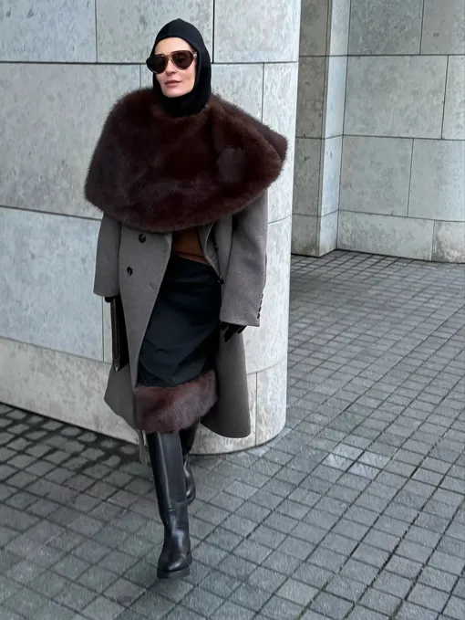 Самый уютный вариант формулы. Меховая манишка не только актуальный аксессуар, но и выступает в качестве антистресса. А юбка с меховой оторочкой поддерживает эту тему, но делает ансамбль более утонченным. За «основу» здесь отвечает мягкий джемпер и серое пальто. А в качестве обуви идеально подойдут сапоги на плоском ходу.