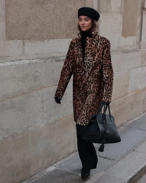 Эффектный дуэт для тех, кто зимой предпочитает не растворяться на сером фоне. Леопардовое пальто работает как заявление, а бирюзовая сумка добавляет свежий акцент. Чтобы образ не выглядел перегруженным, рядом остаются две вечные «основы» — черная водолазка и джинсы. Обувь? Любая. Тут подойдут и высокие сапоги, и ботинки на шнуровке.