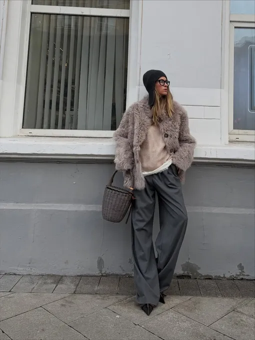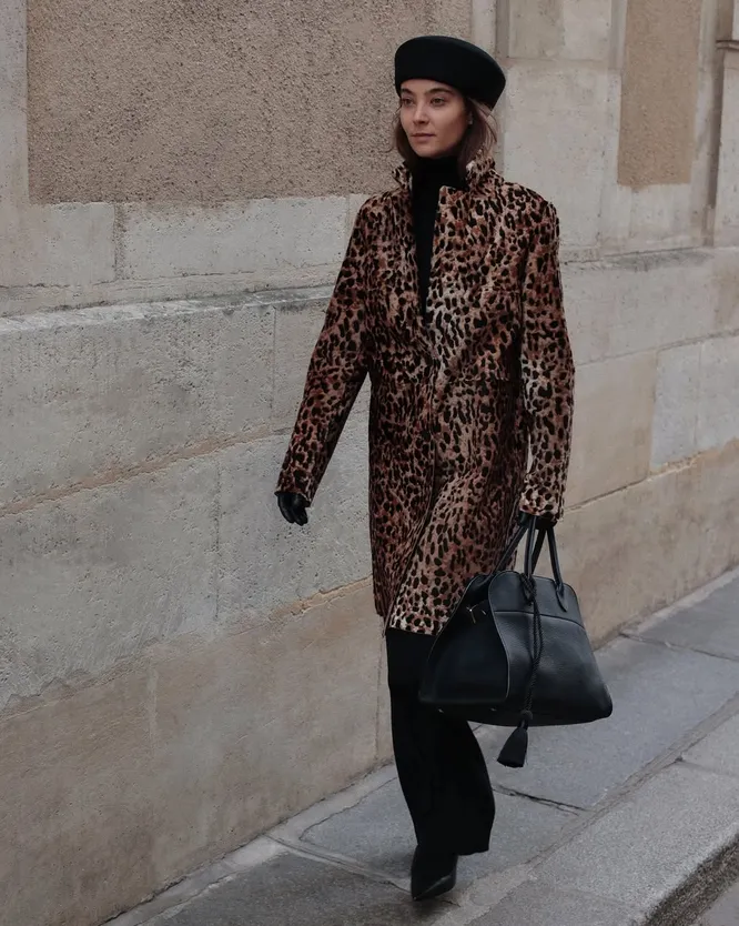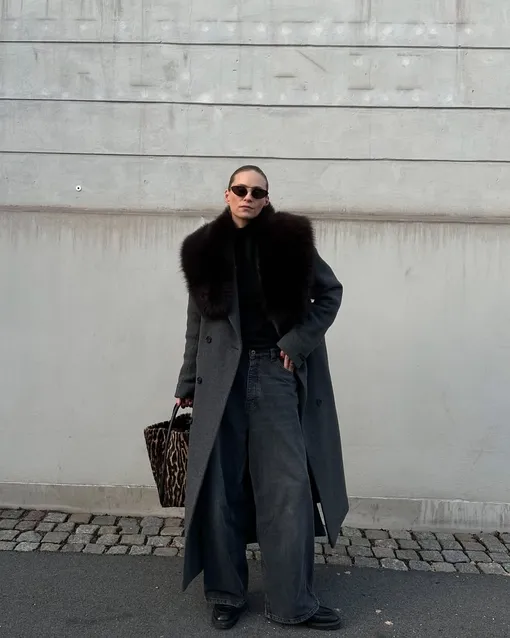 Еще один зимний хит — пальто с меховой оторочкой. Оно создает фактурный акцент, а леопардовая сумка добавляет грамотную дозу дерзости. Базовые черный свитер и серые джинсы выравнивают градус, делая лук практичным. В таком вы сможете провести всю зиму.