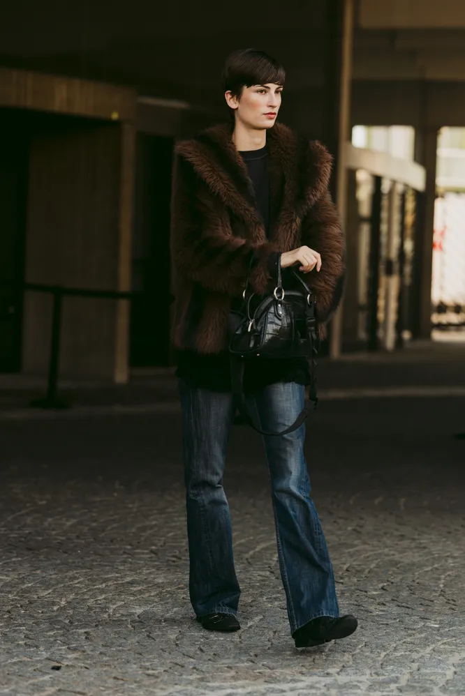 Этот силуэт принято ассоциировать с 70-ми. Хиппи и «диско»-культура выбрали его не случайно. Во-первых, расширение от колена эффектно смотрится в движении. Во-вторых, клеш идеально сочетаются с обувью на платформе (еще одним каноническим айтемом того времени). В наши дни этот камбэк связан не только с ностальгией, но и с тем, что именно этот фасон идет практически каждому. Плюс дизайнеры предлагают самые разные интерпретации: от классических до буткатов. Они уместны и в офисе, и на вечернем мероприятии — просто меняется «верх» и аксессуары. Как стилизовать джинсы-клеш? В нынешнюю погоду они отлично работают с объемной верхней одеждой. Укороченная шуба добавит образу легкости и намека на 70-е, а пушистая версия в длине миди или макси создаст более драматичное настроение. В общем, любая длина будет смотреться эффектно с джинсами-клеш. Чтобы не замерзнуть лучшим вариантом станет, конечно же, теплый свитер с высоким горлом или джемпер с V-образным вырезом. Под такую опцию вы смело можете надеть рубашку или тонкую водолазку в качестве первого «слоя». Такой образ отлично подойдет для особенно морозной погоды. А если вы хотите создать более элегантный лук, то обратить внимание стоит на жакеты. Какой фасон выбрать — оверсайз, приталенный или классический — зависит от ваших предпочтений. Каждый из них будет отлично смотреться с джинсами-клеш. Не забывайте, что такой «низ» отличная инвестиция во вневременной гардероб. Весной вы сможете носить их с мягким шерстяным джемпером и кожаной курткой — образ получится расслабленным, но собранным.