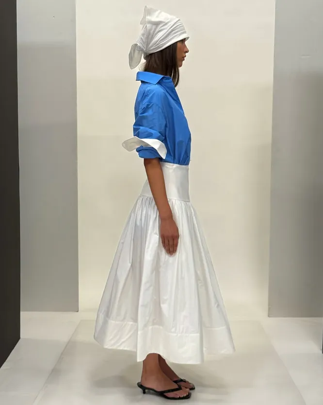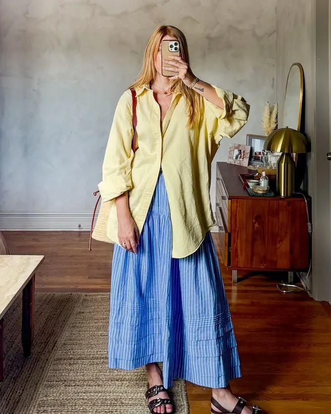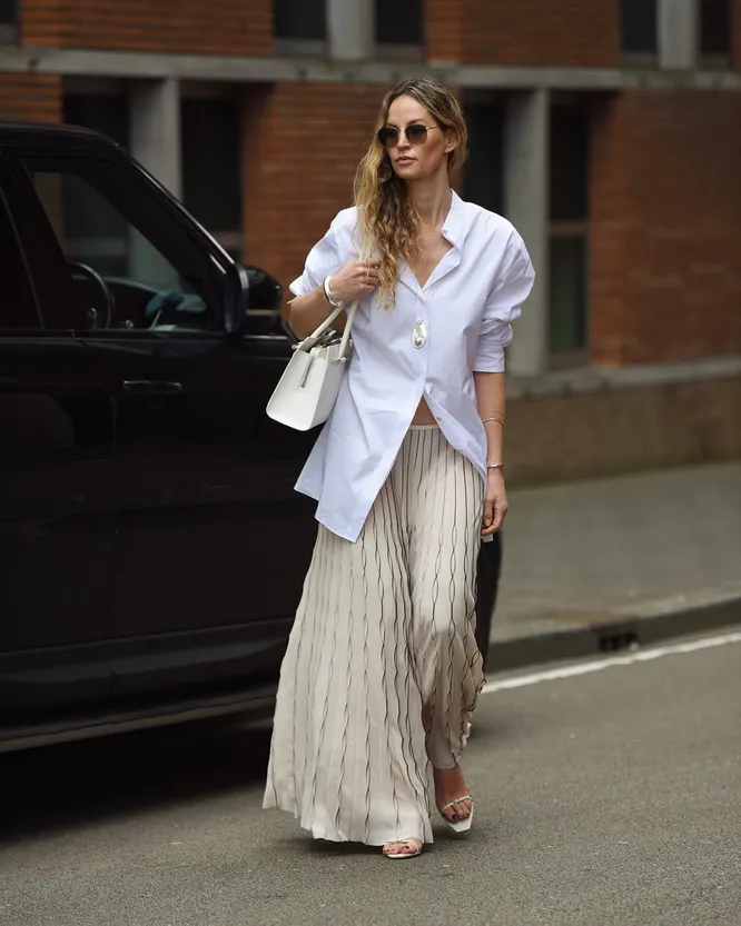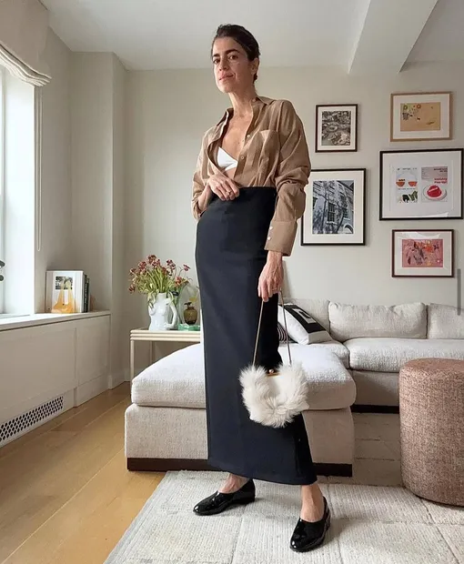 С точки зрения цветовой палитры можно пойти несколькими путями. Первый — монохромный лук. Светлые наряды в белом или сливочном оттенке не только визуально освежают, но и придают особую легкость, особенно в жаркий день. Тотал-блэк — это всегда практично и универсально. К тому же, он делает силуэт стройнее, добавляет наряду элегантности — и не зря остается любимым цветом фэшн-инфлюенсеров даже в разгар знойного сезона. Второй — игра на контрастах. Пример — пастельный «верх» в паре с черным «низом» или оттенок сливочного масла в комбинации с синим или шоколадным. Дополнительные акценты и обувь играют решающую роль. Днем ансамбль отлично дополнят плетеная сумка и кожаные сандалии, вьетнамки или балетки. Вечером — мюли на каблуке или босоножки T-bar и украшения. Кстати, саму рубашку вы можете надеть просто навыпуск, заправить ее в юбку или накинуть на топ или бра. Простота — не значит скучная база. И формула «юбка плюс рубашка» — лучшее тому подтверждение.