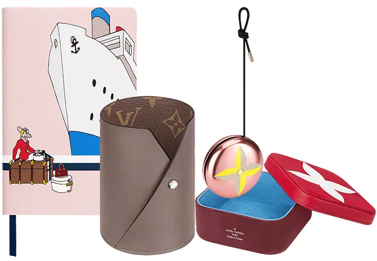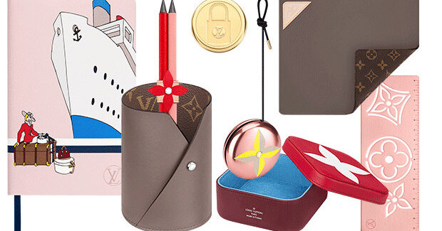 В подарочную линейку вошли три десятка очаровательных мелочей, призванных скрасить повседневную суету в офисе и дома. Здесь есть все: от необходимых письменных принадлежностей вроде блокнотов и обложек с фирменным рисунком Malletage, карандашей, закладок и линеек, украшенных кожаной мозаикой с цветком Monogram, до рюкзаков, кошельков и фоторамок из плексигласа или кожи с тисненым логотипом Дома Louis Vuitton. А еще фарфоровые подносы с иллюстрациями путешествий начала XX века, карманные зеркала с кожаной отделкой, сеты из браслетов и йо-йо.