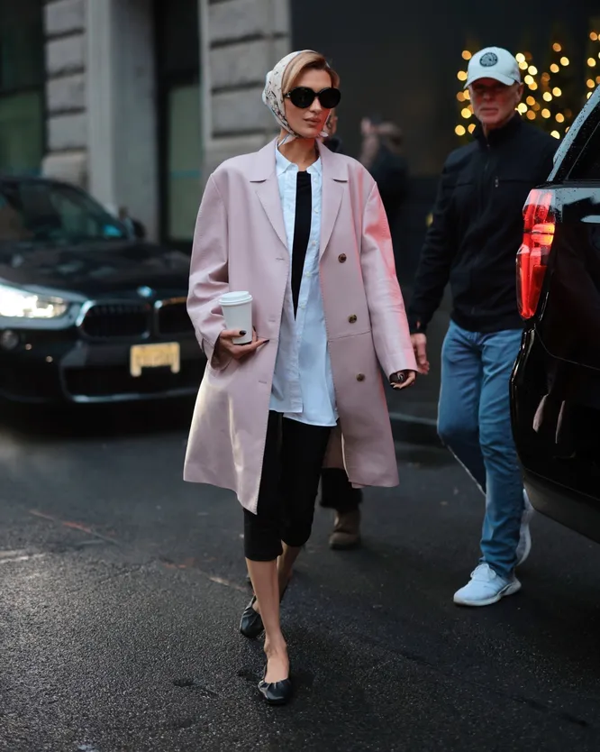 На днях папарацци поймали Беллу Хадид в Нью-Йорке — и этот выход мгновенно разошелся по модным хроникам. Нежно-розовое пальто прямого кроя, надетое поверх удлиненной белой рубашки и черных капри, выстраивает тот самый ретро-силуэт, который так любит Миучча Прада. И здесь важно уточнить: пальто на младшей Хадид как раз от Prada. Шелковый платок, завязанный на манер Одри Хепберн, и акцентные овальные солнцезащитные очки усиливают ассоциации с кинодивами, а стаканчик кофе в руке возвращает образ в городскую реальность. Подиумная эстетика в «живом» исполнении. В этом ансамбле интересно сразу несколько моментов. Первый — цвет верхней одежды. Нежно-розовый оттенок, известный нам как millennial pink, уверенно возвращается в игру. Этот тон существовал задолго до поколения Y, но именно миллениалы превратили его в визуальный код эпохи. Тогда розовый окончательно избавился от ярлыка инфантильности и получил новый статус. Спустя десять лет он снова выглядит свежо и интересно. Второй важный элемент — брюки-капри. Тренд спорный, но устойчивый: он держится уже второй сезон и явно не собирается исчезать. Эта длина требует внимательного подхода: она, к сожалению, может «резать» рост и утяжелять силуэт. Именно поэтому выбор обуви здесь решает все. Белла делает ставку на балетки — логичный и деликатный вариант.