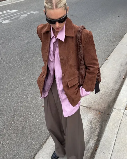 Замша — фаворит сезона. Эльза показывает, как использовать ее вне привычных дуэтов. Например, наденьте нежно-розовую рубашку с жакетом из замши. Дополните ансамбль строгими брюками и лоферами. Такой микс выглядит «дорого» и чуть неожиданно — а значит, именно так, как требует современная мода.