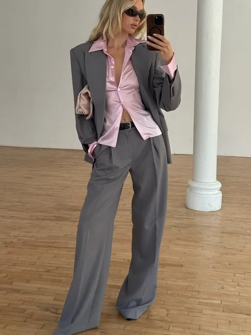 Работать в офисе — тренд. И модный мир не просто возвращает нас в офис, а делает это так, что туда хочется пойти ради наряда. Если вы предпочитаете более лаконичные решения, обратите внимание на сочетание классического костюма и сатина. Серый костюм в комбинации с розовой шелковой рубашки — пример идеального баланса между деловым стилем и мягкой женственностью. Деликатный блеск ткани добавляет аутфиту глубины, а сам цвет становится едва уловимым, но выразительным акцентом. Такой вариант подойдет и для работы, и для вечернего выхода. Достаточно лишь сменить плоский ход на каблук и добавить аксессуары.