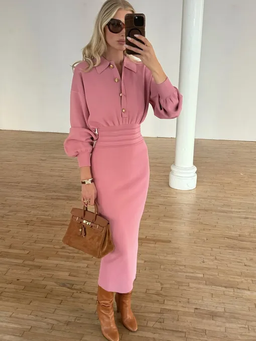 Розовый способен быть не только игривым и наивным, но и изысканным. Платье-миди в приглушенном пудровом оттенке с длинными рукавами — идеальный выбор для тех, кто любит элегантные силуэты. Ретро-модель Хоск сочетает с высокими кожаными сапогами и сумкой top-handle. А сверху можно накинуть трендовое пальто-кейп.