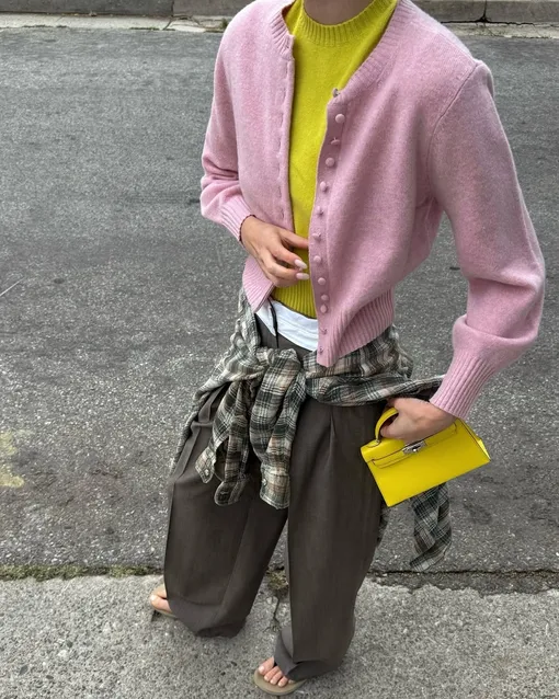 Если вы избегаете акцентной гаммы из-за страха перегрузить образ, стоит взять пример с Эльзы. Она демонстрирует, как экспериментаторский подход к цвету может выглядеть уместно и изысканно. Один из самых эффектных приемов — колор-блок. Фисташковый свитер, розовый кардиган и серые брюки в одном ансамбле создают сложную, но очень гармоничную цветовую композицию. Многослойность здесь играет ключевую роль: контраст текстур и оттенков делает комплект интересным и свежим.
