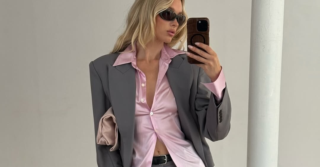 Работать в офисе — тренд. И модный мир не просто возвращает нас в офис, а делает это так, что туда хочется пойти ради наряда. Если вы предпочитаете более лаконичные решения, обратите внимание на сочетание классического костюма и сатина. Серый костюм в комбинации с розовой шелковой рубашки — пример идеального баланса между деловым стилем и мягкой женственностью. Деликатный блеск ткани добавляет аутфиту глубины, а сам цвет становится едва уловимым, но выразительным акцентом. Такой вариант подойдет и для работы, и для вечернего выхода. Достаточно лишь сменить плоский ход на каблук и добавить аксессуары.