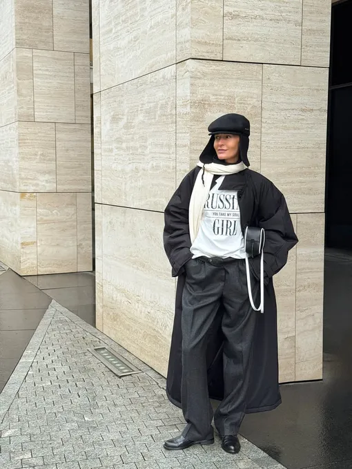 Элегантность и комфорт вполне совместимы даже в мороз. Серые классические брюки легко интегрируются в зимние ансамбли с пуховиком, особенно если дополнить их лаконичным «верхом» и теплой парой на плоском ходу. Такой наряд выглядит собранно и актуально, а шапка-ушанка добавляет характер и легкий стилистический контраст.