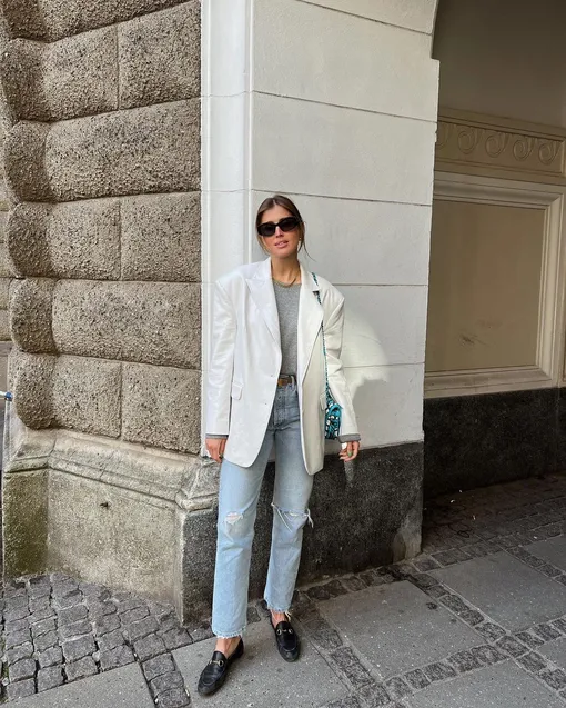 Моментально добавит образу шика белый жакет: он всегда выглядит наряднее и изящнее базового черного или серого. Особенно здорово он будет смотреться со светлым денимом — например, «выстиранным» голубым. Такой образ даже не нужно дополнительно поддерживать аксессуарами: достаточно добавить классические лоферы и ваши любимые украшения.