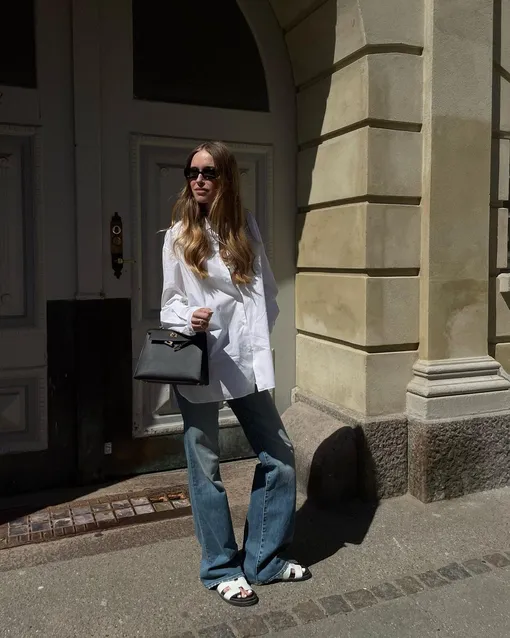 Любой базовый образ станет интереснее, если поиграть с пропорциями и силуэтом. Например, вместо обычной рубашки надеть с джинсами удлиненное платье-рубашку. А прямые или широкие джинсы заменить на слегка расклешенные книзу. Дополните это комбо удобными сандалиями или лоферами и классической сумкой — и готово: вы великолепны.