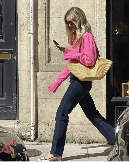Еще один секрет «дорогого» образа — правильная расстановка акцентов и грамотная игра на контрастах. Попробуйте добавить луку яркости с помощью розовой, зеленой или желтой блузки. Чтобы скомпенсировать это буйство красок, выбирайте темный деним — темно-синий или даже черный. Завершите комбо соломенной сумкой и изящными мюлями на небольшом каблуке.