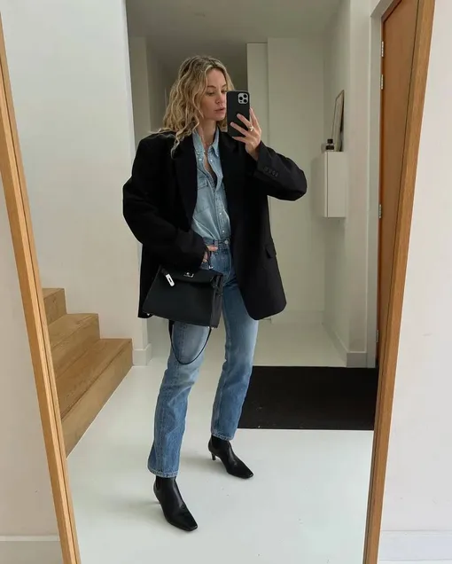 «Канадский смокинг» — рубашка из денима и джинсы — это настоящая вечная классика. Но даже без того удачное комбо можно сделать еще лучше. Просто добавьте к этому сочетанию классический черный или темно-серый жакет, будто с мужского плеча. Он сразу же облагородит образ и сделает его более строгим и собранным. А джинсовая рубашка вместо обычной белой, напротив, освежит и добавит остроты. Носить такое комбо можно и с каблуками, и с лоферами, и с кроссовками или кедами.