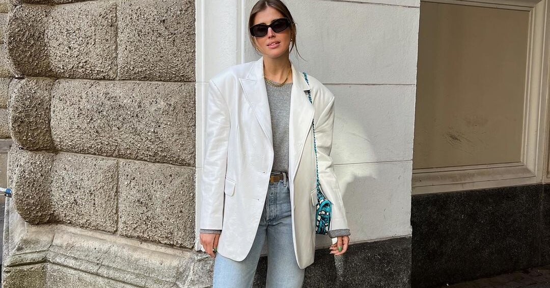 Моментально добавит образу шика белый жакет: он всегда выглядит наряднее и изящнее базового черного или серого. Особенно здорово он будет смотреться со светлым денимом — например, «выстиранным» голубым. Такой образ даже не нужно дополнительно поддерживать аксессуарами: достаточно добавить классические лоферы и ваши любимые украшения.