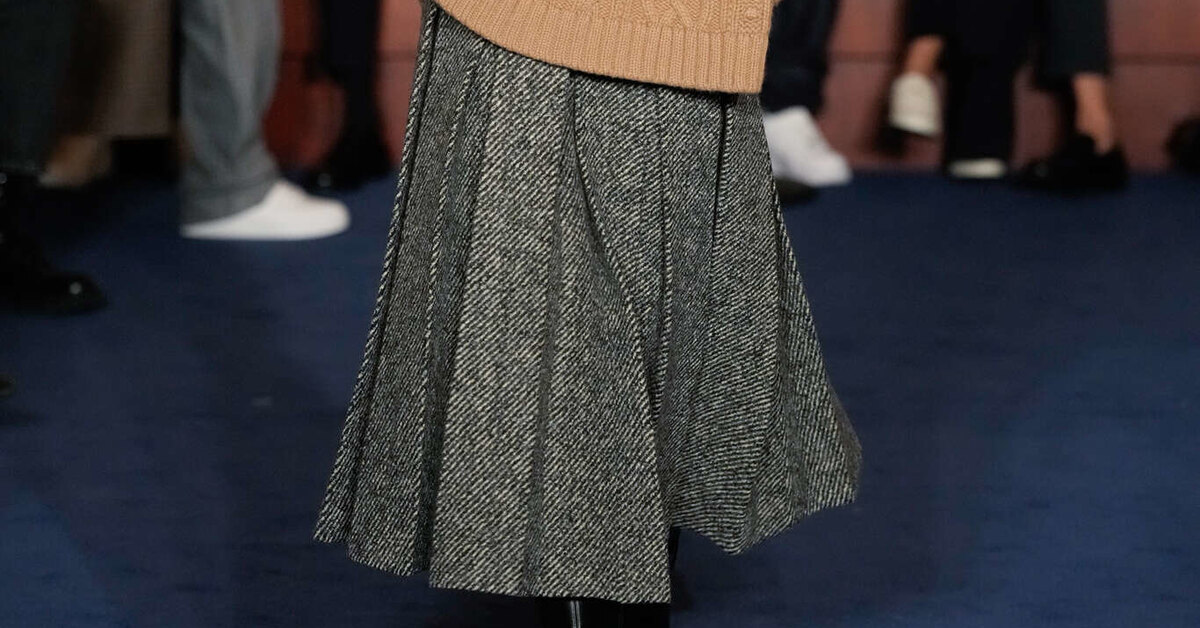 Так как женственные образы в этом сезоне только укрепили свои позиции, то этот элемент появился у многих брендов: и не только в классическом исполнении, но и в разных фактурах и длинах. Но, конечно же, везде прослеживается классический фирменный фасон — узкая талия, расширяющаяся к низу и силуэт, напоминающий солнце. На показах она представлена вариантами на все случаи жизни. Модельеры создали в складку, на поясе, с асимметричным подолом, с высокой или средней талией. Бренд Tommy Hilfiger в этом сезоне представил самые универсальные варианты — плиссированные из шерсти в черном и сером цвете. Еще одну базовую модель в черном оттенке, но из кожи, сделала марка Altuzarra. Ее стилизуют со свитером и с высокими сапогами. Не менее интересную юбку представил Burberry — в пол с принтом в клетку.
