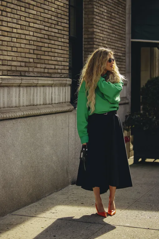 Еще один пример стильного эклектичного образа: спортивный по духу свитшот яркого оттенка отлично сочетается с женственной юбкой в стиле New Look. Уравновешивают эти полярно заряженные элементы ремень, акцентирующий талию, и, конечно же, лодочки.