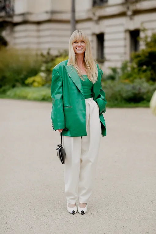 Помните: если вы выбираете классические силуэты, то ваш главный инструмент — это цвет. Именно он «вытянет» образ и добавит ему красок (во всех смыслах этого слова). Если необычных ярких сочетаний вы побаиваетесь, то смело смешивайте светлые оттенки с насыщенными. Например, белые брюки с ярким кожаным жакетом. Лодочки при этом могут быть любого цвета, но мы бы выбирали в тон брюкам: вкупе с острым мысом это сделает ноги буквально бесконечными.