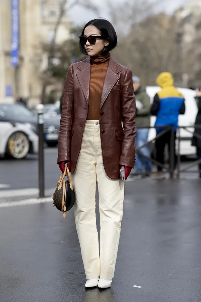 Самым простым и актуальным верхом для базовых моделей джинсов станет кожаный жакет. Его можно носить поверх футболок и водолазок, он не боится весеннего дождя и отлично заменит более спортивные и объемные куртки.