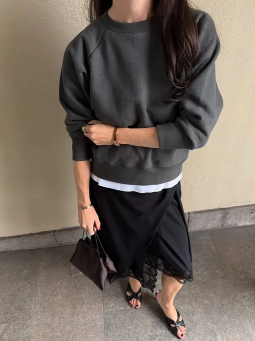 Контраст, который всегда работает. Спортивный свитшот и кружевная юбка создают интересное «напряжение». Женственность и расслабленность встречаются в одной точке — и за счет этого комплект выглядит современно.