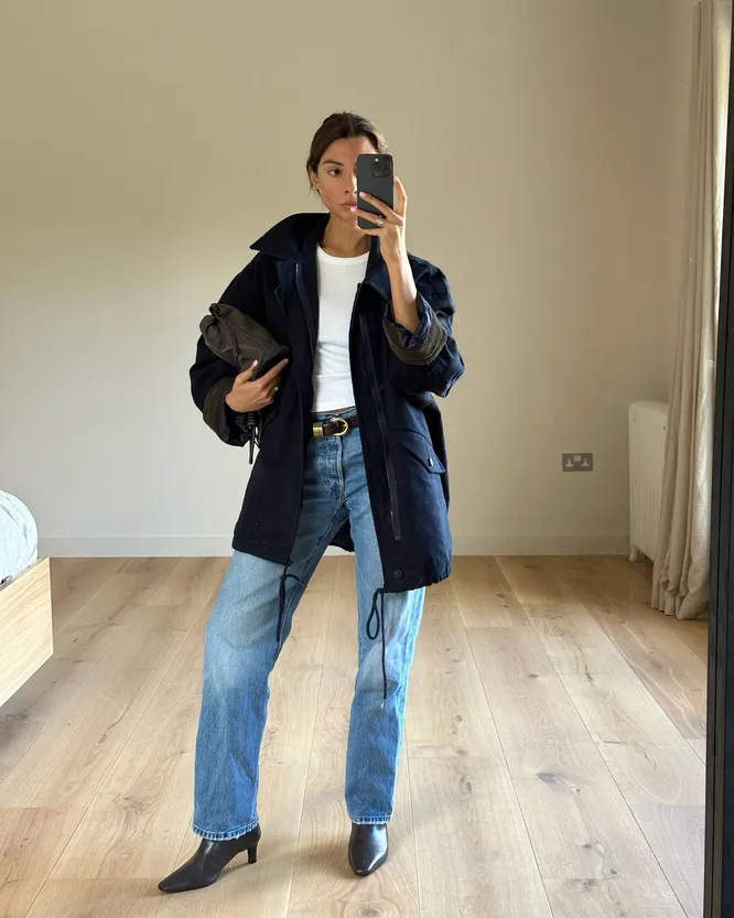 Обувь также играет ключевую роль в создании элегантного лука с джинсами. Ботильоны или сапоги на каблуке придадут силуэту дополнительный рост и утонченность. Можно добавить ремень с минималистичной пряжкой, чтобы акцентировать талию и завершить нард. Аксессуары, такие как классическая сумка или элегантные серьги, добавят финальный штрих, делая образ цельным и гармоничным. А теперь давайте от теории перейдем к практике. Пока еще позволяет погода миксуйте ваши любимые пары с туфлями-слингбэками (чтобы точно не замерзнуть можно добавить тонкие полупрозрачные гольфы). Самый стильный вариант к джинсам — ботильоны на небольшом или устойчивом каблуке. Они удобные и с запросом на на лук в духе ladylike справляются идеально. А к концу осени замените их на трендовые сапоги (высокие, ботфорты, жокейские или ковбойские). Сами джинсы с такими вариантами можно носить как навыпуск, так и заправить. А больше идей для аутфитов ищите в галерее ниже.