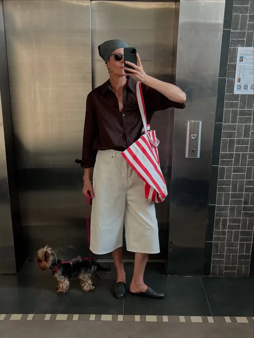 Если хочется сделать бермуды более выразительными, поменяйте контекст. Белая майка, черный кожаный жакет и мюли на устойчивом блочном каблуке — простая формула, которая сразу меняет впечатление от аутфита. Такой прием вытягивает силуэт и добавляет образу стиля, не жертвуя вашим комфортом.