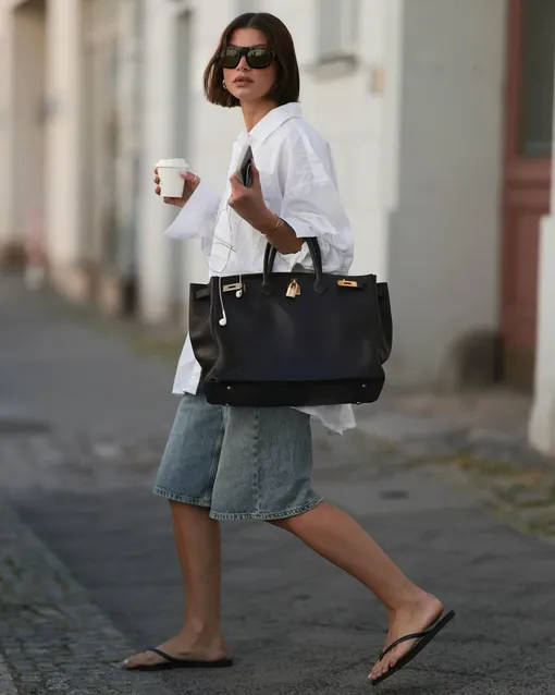 Вьетнамки — неотъемлемая часть летнего гардероба. И носить их можно не только на море. С бермудами они работают особенно органично. Для более делового лука добавьте белую рубашку и лаконичную черную сумку. Получится баланс между расслабленностью и офисной строгостью. А если хотите громкий тренд, то вам нужны вьетнамки на платформе.