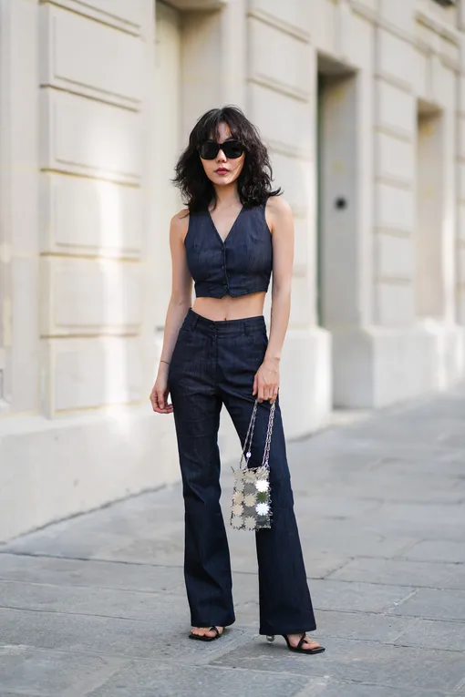 Еще один способ создать сбалансированный силуэт с джинсами клеш — обувь на высокой шпильке. Выигрышнее всего будут смотреться открытые босоножки с ремешками и переплетениями: они и прибавят вам роста, и сделают стопу еще более изящной. Такой вариант понравится минималистам: образ не будет выглядеть перегруженным.