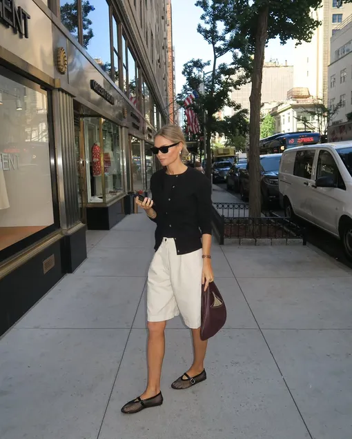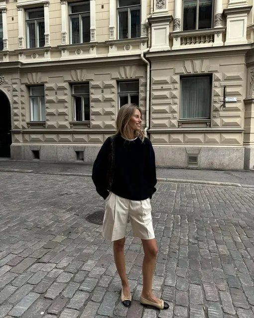 «Городская» вариация заканчивается до колена и благодаря плотной непросвечивающей ткани выглядит очень презентабельно. Обычно она выполнена в белых или серых тонах, но сейчас из-за популярности природной палитры эти шорты приобрели много новых цветов: среди них — хаки, кофейный, карамельный, нежно-голубой и светло-зеленый. Носить их можно внутри монохромных льняных комплектов в белом цвете или с контрастным верхом в виде черного хлопкового лонгслива и трикотажного кардигана ему в тон. А если вы хотите создать менее аскетичный строгий лук, то советуем выбирать модель в пастельных тонах — например, розовом или небесном — и сочетать ее с майкой-алкоголичкой и «желейными» босоножками.
