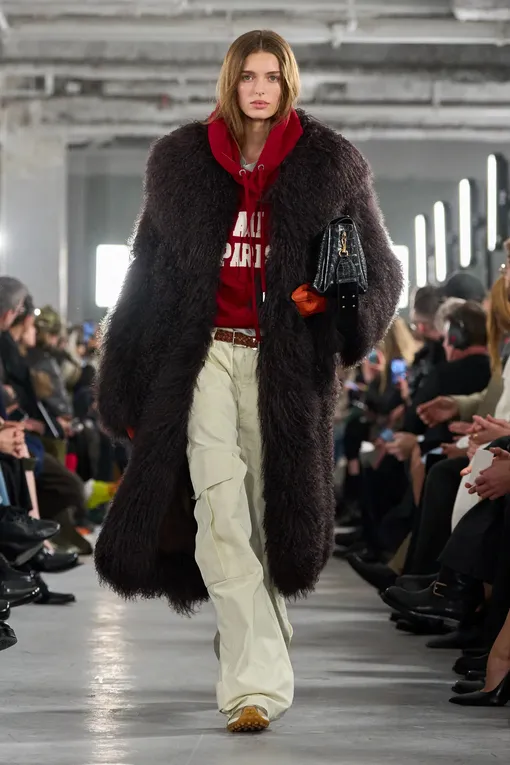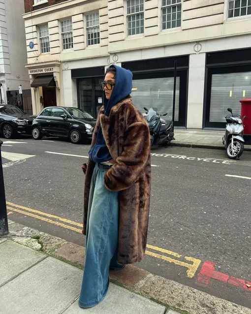 Начнем с шубы. Сегодня она уверенно занимает центральное место в зимней капсуле и давно вышла за рамки верхней одежды «для выхода». Форматов больше, чем кажется: макси, длиной до середины бедра, расслабленного силуэта, с подчеркнутой талией или капюшоном. Выбор меха — вопрос личных взглядов. Большинство брендов сделали ставку на технологичный эко-мех: он выглядит красиво, спокойно переживет мокрый снег и резкие перепады температуры. И, конечно, более бюджетный. Толстовка в этом уравнении работает как контраст. Диапазон фасонов понятный: модель на молнии, укороченный вариант или кроя оверсайз. Зато именно здесь можно позволить себе больше свободы. Яркий цвет — красный, оранжевый, желтый — добавляет энергии зимнему образу и работает как терапия. Принт тоже уместен, если хочется сместить акцент и сделать комплект более индивидуальным. «Низ» — джинсы. Прямые, широкие или буткаты. Альтернатива — свободные брюки, которые поддерживают расслабленное настроение. А если хотите примерить тренд, то делайте ставку на брюки-карго. В качестве обуви можно выбрать угги, утепленные ботинки, мунбуты или сапоги-йети. При желании игру на контрастах можно усилить — добавить ботильоны на каблуке или высокие сапоги. Такой прием особенно эффектен. Так, к слову, делает Рианна.