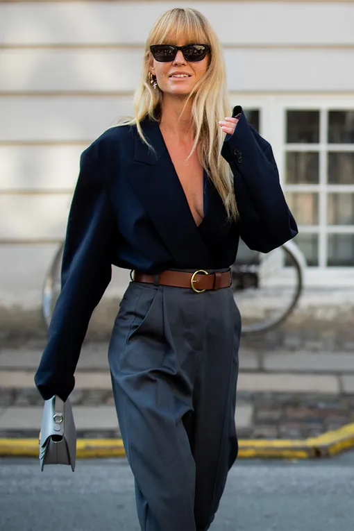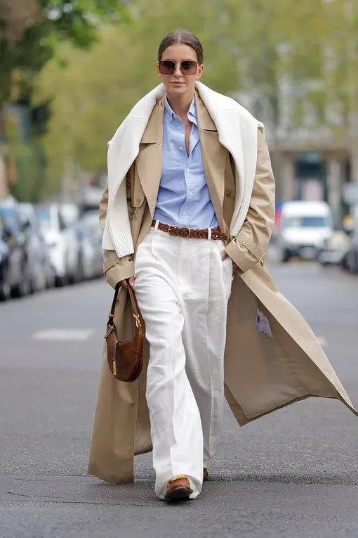 Конечно, коричневый. Он смотрится с белыми или бежевыми брюками или юбкой куда мягче. Это не такое контрастное решение, как черный ремень — и уж точно куда более оригинальное. Такой аксессуар не будет перетягивать на себя слишком много внимания, но станет отличным завершающим акцентом, объединяющим все элементы лука между собой. Подобно клею, он держит все детали вместе — и обеспечивает вам завершенный образ. Уместны будут все оттенки коричневого — от насыщенного цвета темного шоколада до легкого тона загара, близкого к бежевому. Помните: чем ближе оттенок ваших брюк к кипенно-белому, тем светлее вы можете выбирать ремень. Если же говорить о форме, то лучшим выбором станет классический «мужской» ремень с лаконичной металлической пряжкой. Им можно как акцентировать талию, так и сместить акцент на бедра, если вы носите брюки или юбку с низкой посадкой.