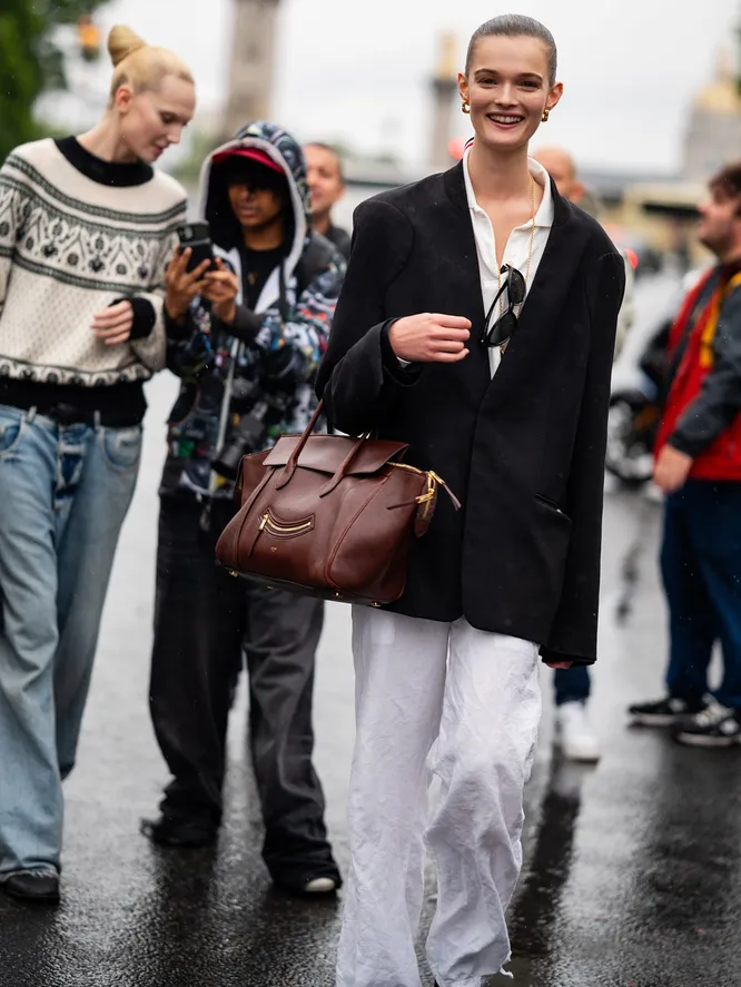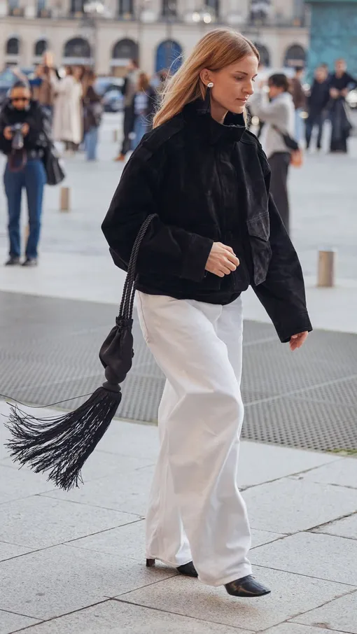Формулу «белый верх + черный низ» все помнят со школьных лет. Попробуйте поменять ее местами. Контраст работает свежо и выразительно. С белыми джинсами отлично сочетается черная замшевая куртка с карманами. К образу подойдут ботильоны — они добавят собранности ансамблю и защитят деним от весенних луж. Финальный штрих — сумка-кисет. Такой аксессуар добавляет мягкую элегантность.