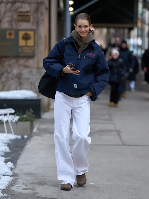 Без спортивного настроения эту подборку представить сложно. Белые джинсы отлично вписываются и в такие аутфиты. Начните с толстовки с капюшоном, а сверху добавьте куртку «рабочего». Такой дуэт выглядит расслабленно и отлично подходит для межсезонья. Образ можно завершить кроссовками или кожаными сапогами, напоминающими носки. Белые джинсы легко подстраиваются под разные настроения: от элегантных до спортивных. Именно поэтому каждую весну они снова оказываются в центре внимания.