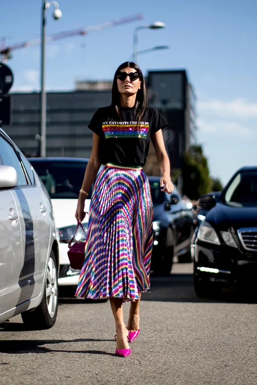 В осенне-зимних коллекциях текущего сезона дизайнеры не пожалели блеска: глиттер, пайетки и, конечно же, люрекс. Целые комплекты из люрекса можно было лицезреть на показах Gucci, где сияющую мелкую плиссировку было видно с последнего ряда. Где-то глубоко в нашем сознании эта металлизированная ткань ассоциируется с чем-то вульгарным, но времена меняются — и пора оставить предрассудки в прошлом и обзавестись притягивающей взгляды вещицей. Для осенней поры особенно актуален трикотаж с добавлением люрекса: топы, джемперы, платья, брюки. Икона французского стиля Жанна Дамас уверена, что нет лучшего наряда на вечеринку, чем переливающийся топ. В преддверии Хеллоуина, новогодних праздников и корпоративов это особенно актуально.