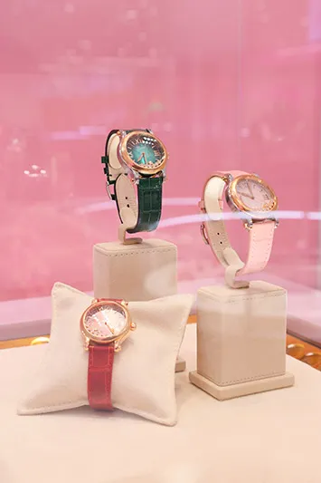 На первом этаже ЦУМа открылось pop-up пространство Chopard, посвященное новой коллекции женских часов Happy Sport. Нежно-розовое пространство как нельзя лучше напоминает о приближении 8 марта и намекает, что о подарках себе и близким стоит позаботиться заранее. Помимо новинок в витринах представлены и другие модели линейки: Happy Hearts с плавающими на циферблате бриллиантами и сердцами, летние Happy Fish с золотой рыбкой и торжественные Happy Palm с золотой пальмовой ветвью.