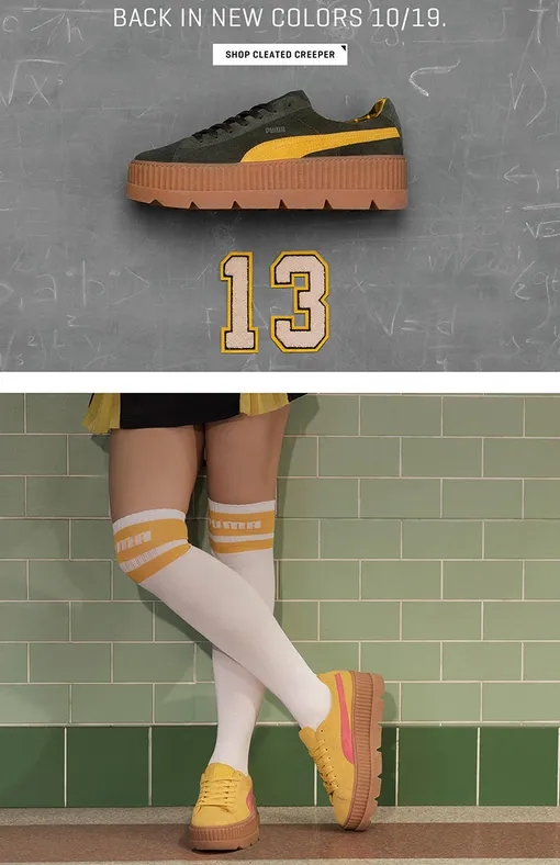 Новости для преданных поклонников Рианны и ее коллекций Fenty x Puma by Rihanna: в продажу поступили новые итерации знаменитых криперов из осенне-зимней линейки текущего сезона. Теперь The Cleated Creeper можно приобрести в ярких зеленом и желтом цветах. Ищите в фирменных корнерах Puma в московском «Цветном», питерской «Галерее» и на ru.puma.com.