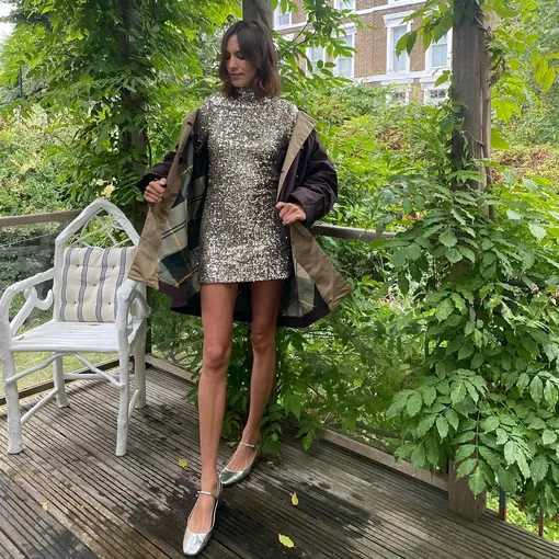 Пайетки и металлик — идеальный способ добавить искру в свой лук. Пусть это будет платье, отсылающее к культовому образу Кейт Мосс в золотом мини из Topshop. А может быть что-то более нарядное, оставшееся у вас с новогодних вечеринок. Главное — сбалансировать «сияние». К примеру, летней паркой («теория неправильного пальто» — все еще большой тренд), грубой обувью или простыми аксессуарами.