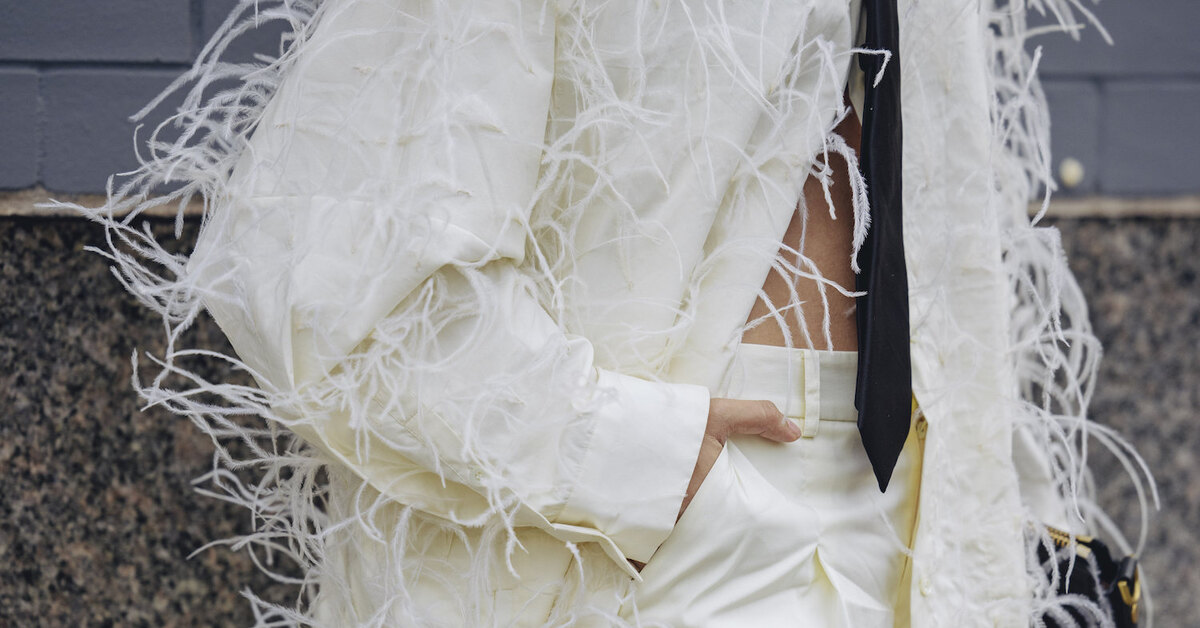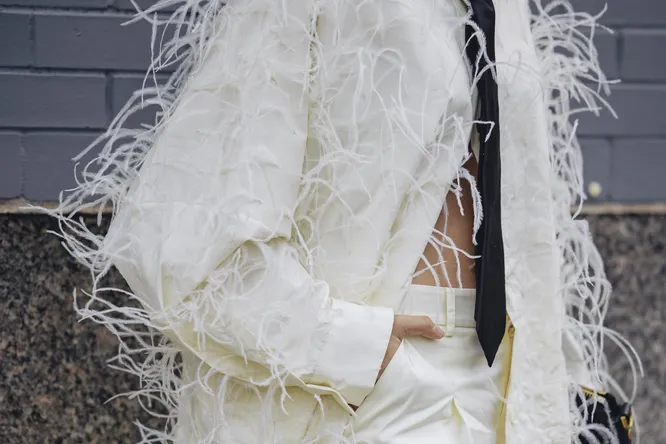 Еще один материал, который безошибочно считывается как «нарядный» — перья. Облачиться в них с ног до головы, как дива золотого века Голливуда, мы вас не заставляем. А вот небольшая деталь (скажем, оторочка на рукавах рубашки или шарф-боа) будут весьма кстати. И вызовут шквал комплиментов в ваш адрес.
