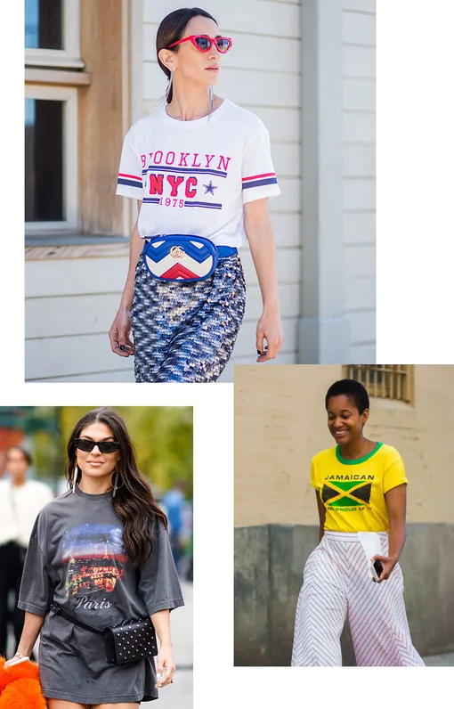 Кто бы мог подумать, что футболки, которыми забиты сувенирные лавки в самых популярных локациях для путешественников, войдут в число любимых вещей стритстайлеров. Однако с легкой руки Демны Гвасалии, который выпустил под брендом Balenciaga типичную «туристическую» футболку с изображением главного символа Парижа, это стало реальностью. Модные и находчивые сразу смекнули, зачем платить 300 евро за футболку от именитого французского модного Дома, когда можно обойтись «оригинальной» футболкой с названием любой географической точки намного дешевле. К тому же и город можно выбрать самостоятельно. Поэтому вместо магнитов везем из отпуска футболки и смело носим с джинсами и костюмами.