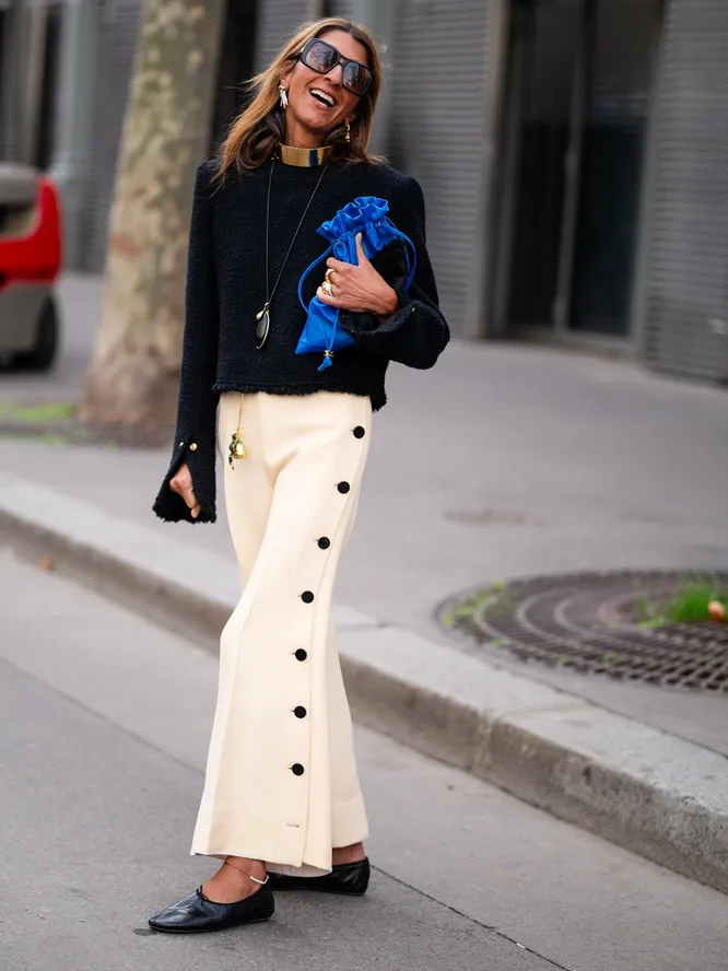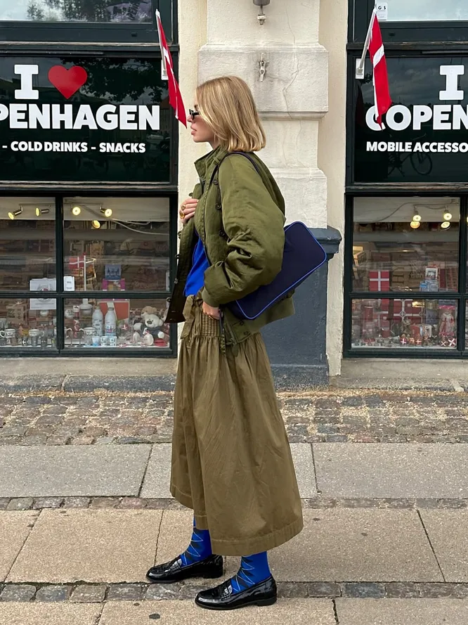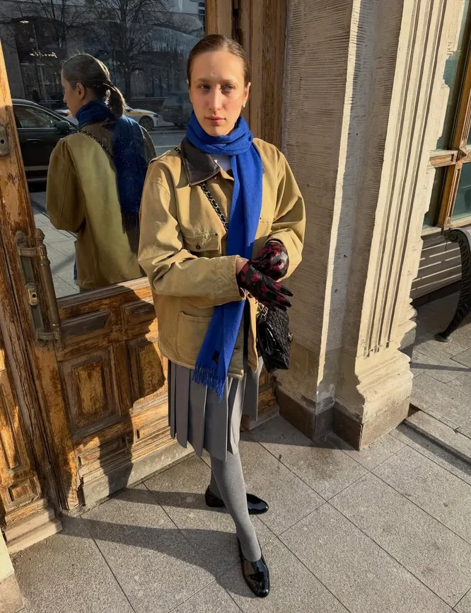 Правило простое: берите кобальтовую вещь и вписывайте ее в образ, где по логике она не планировалась. Самый легкий шаг — аксессуары. Кепка, шапка, шарф, сумка, ремень или даже носки (колготки). Синюю шапку носите с худи, джинсами и кроссовками. Если хотите усложнить, добавьте элемент с анималистичным принтом. Или черный тотал-луку дополните кобальтовыми носками или кожаными перчатками. Если чувствуете уверенность, внедряйте акцент в более насыщенные сочетания: ярко-синий шарф миксуйте в дуэте с леопардовым пальто, или к красным туфлям-лодочкам подберите колготки этого тона. Поддержите аксессуар обувью в тон, и ансамбль станет выразительнее. А если в гардеробе уже есть кобальтовый свитер, жакет, платье или брюки, эксперимент будет еще смелее. К примеру, накиньте джемпер поверх любой верхней одежды. Или носите брюки с блузой в бело-фиолетовый цветочек. Электрический синий работает как художественный жест: всего один мазок, и привычная комбинация начинает звучать по-новому. Иногда достаточно одного цвета, чтобы выстроить весь образ вокруг него.