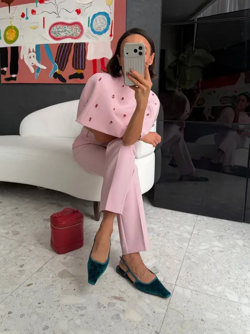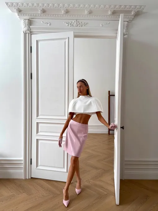 Что такое топ-кейп? Это гибрид топа и накидки, собственно кейпа. У него нет классических рукавов, часто встречаются асимметрия, вырез «лодочка», высокий воротник или удлиненная спина, создающая эффект шлейфа. Топ-кейп легко меняет настроение в зависимости от материала. Плотная костюмная ткань делает его более элегантным, шифон добавляет легкости и «воздуха», а прозрачные версии с декором усиливают вечерний эффект. Это вещь, которая не требует сложных дополнений — она уже задает тон всему образу. Именно поэтому топ-кейп может быть черным или белым, так как цвет здесь играет второстепенную роль. Но встречаются и опции в более интересных решениях: яркие алые, в пастельной гамме или с декором. Как его носить? Стилизовать его проще, чем кажется. Самое очевидное решение — классические брюки или юбка в длине миди или макси. Такая вроде бы нарядная база уравновешивает сложный «верх». Брюки могут быть прямыми, зауженными или клеш. А юбку выбирайте максимально простую, не усложняйте себе задачу. Обувь пусть поддерживает это настроение. Туфли-лодочки, туфли-слингбэки или пара на удобной танкетке сработают без ошибок. Босоножки? Актуальные с Т-образным ремешком.