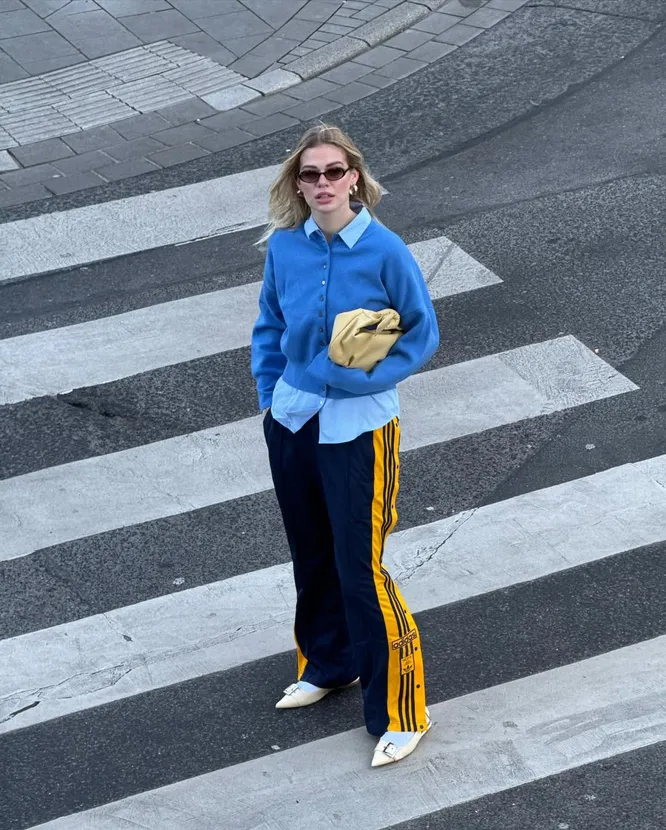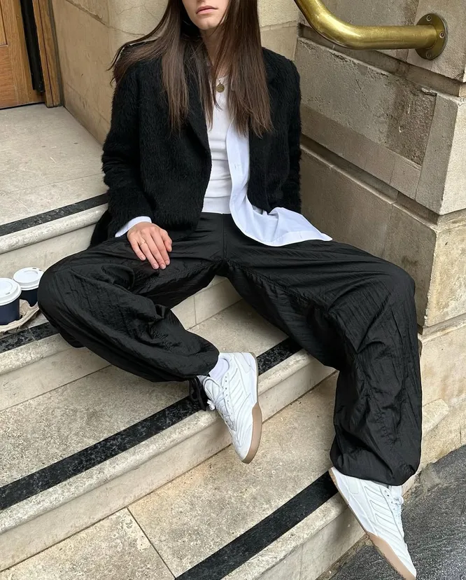Обувь — важный элемент, от которого во многом зависит итоговое впечатление. Естественно, в этом тандеме прекрасно работают лоферы, закрытые мюли, тапочки-бабуши, сабо или простые кеды. Но если вы хотите выркутить спорт-шик на максимум, то дополните это комбо более элегатными парами: балетками, мюлями на каблуке или туфлями-слингбэками. Дополните образ минималистичным кожаным шоппером и парой неброских украшений — и вот вы уже выглядите как героиня стритстайла, а не как человек, который просто решил сэкономить время утром. Новый офисный дресс-код не диктует правил, а предлагает бесконечные вариации.