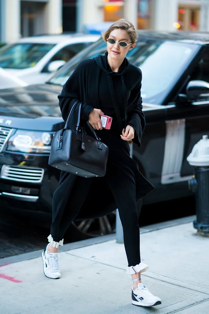 Вчера фотографы засняли модель во время прогулки в Нью-Йорке. На этот раз Джиджи сделала ставку на максимально лаконичные и простые вещи, решив отдать предпочтение спортшику. Поверх обычного худи с капюшоном она надела удлиненный кардиган. Брюки девушка выбрала тоже трикотажные, но вместо классических спортивок Хадид предпочла оригинальную модель с контрастными белыми воланами. Они сгладили переход от черного «верха» к светлому «низу» — кроссовкам. Дополнили образ сумка классической формы и лента-браслет на щиколотке.