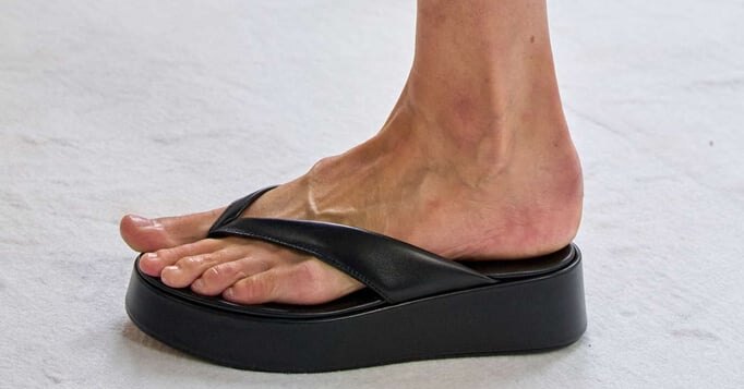 В этом году ключевое слово в обувном мире — ugly shoes. Клоги, «биркенштоки» и, конечно, туфли peep-toe — все это уже давно перестало быть поводом для удивления. Плюс все новые вариации каждый год появляются на подиуме, а фэшн-инфлюенсеры одним за одним подхватывают тот или иной «безобразный» тренд. Сначала мы отрицали, потом свыклись, а что мы видим сейчас? Мы все полюбили желейные сандалии и присматриваемся к актуальным нынче гибридам. В какой-то момент мы все перешли рубеж, за которым самобытность стала важнее общепринятой красоты. Именно на этой волне возрос интерес ретро-вариациям вьетнамок на платформе. Да, тех самых, которые обожала Дженнифер Энистон в конце 90-х. Если сравнивать с их минималистичными аналогами на тонкой подошве, они выглядят куда выразительнее. Они сохраняют всю непринужденность и утилитарность, но при этом смотрятся интереснее за счет платформы. А еще она дополнительно визуально вытягивает силуэт. У актуальных версий платформа может быть самой разной — от небольшой, едва заметной (идеальный выбор для тех, кто ценит комфорт и минимализм), до выразительной танкетки, которая добавит несколько сантиметров роста, не лишая устойчивости. А для самых смелых модниц — экстремально высокая платформа, в духе ранних 2000-х, которая превращает даже самый простой образ в модное заявление. Что касается материала, то это может быть не только ПВХ, но и натуральная кожа.
